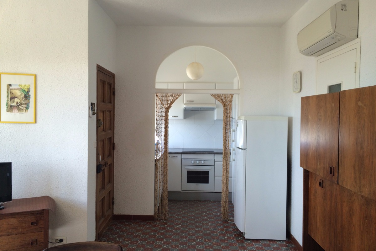 Séjour, cuisine attenante aménagée avec lave-vaisselle et lave-linge, micro -ondes, plaque à induction, four, réfrigérateur avec compartiment congélation.